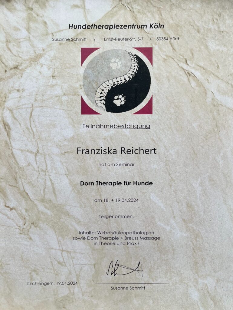 Mit der Weiterbildung in der Dorn-Therapie für Hunde erweitere ich mein Angebot um spezialisierte Wirbelsäulen- und Manualtherapie.